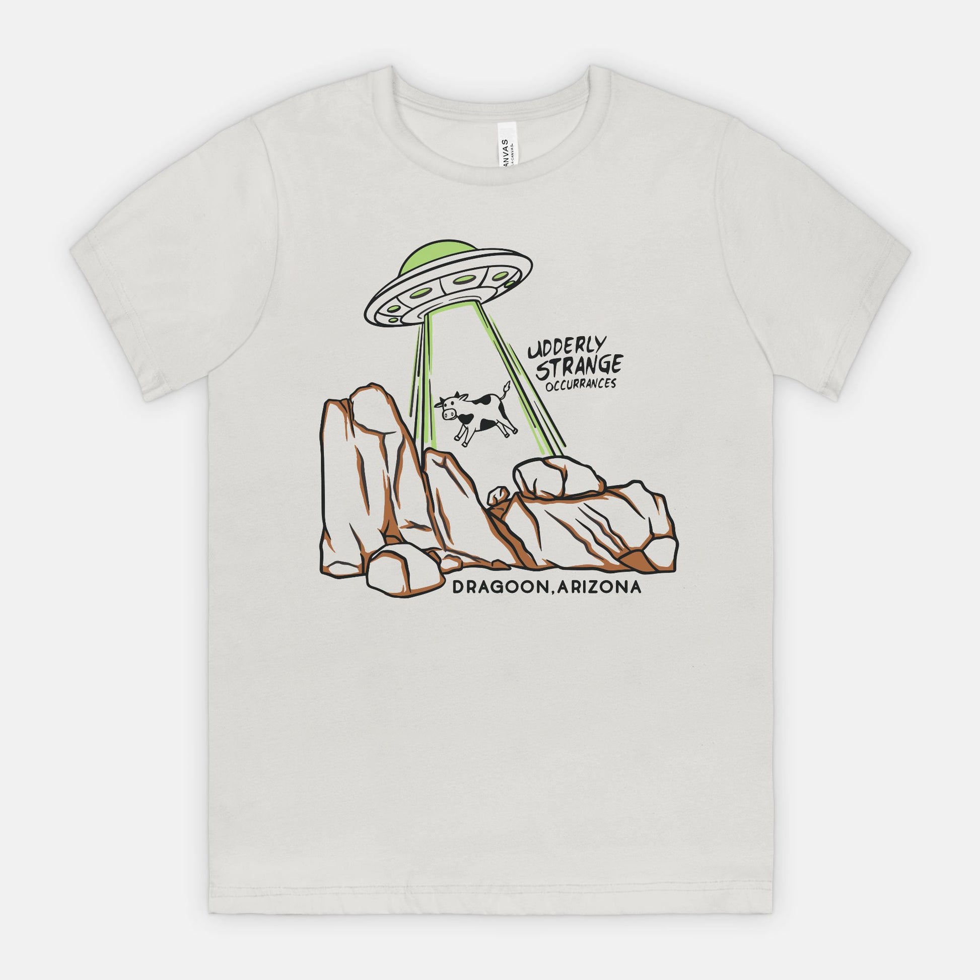 Get ready for out-of-this-world laughs with this t-shirt featuring a hilarious cow alien abduction scene over the Dragoon Mountains! With the tagline 'Udderly Strange Occurrences,' it’s the perfect blend of Southwestern charm and extraterrestrial mischief.