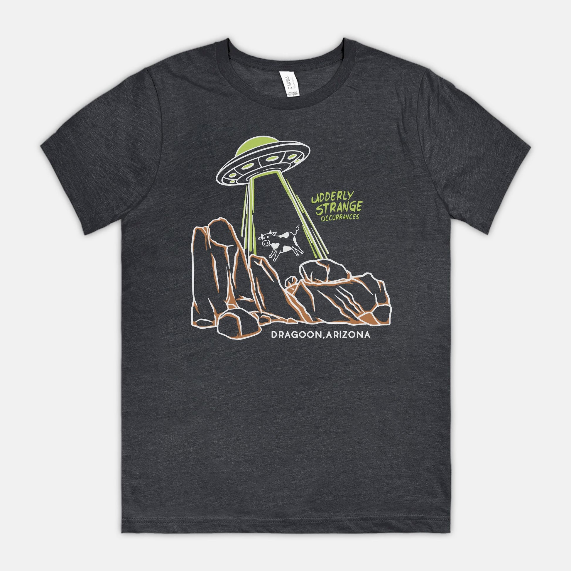 Get ready for out-of-this-world laughs with this t-shirt featuring a hilarious cow alien abduction scene over the Dragoon Mountains! With the tagline 'Udderly Strange Occurrences,' it’s the perfect blend of Southwestern charm and extraterrestrial mischief.