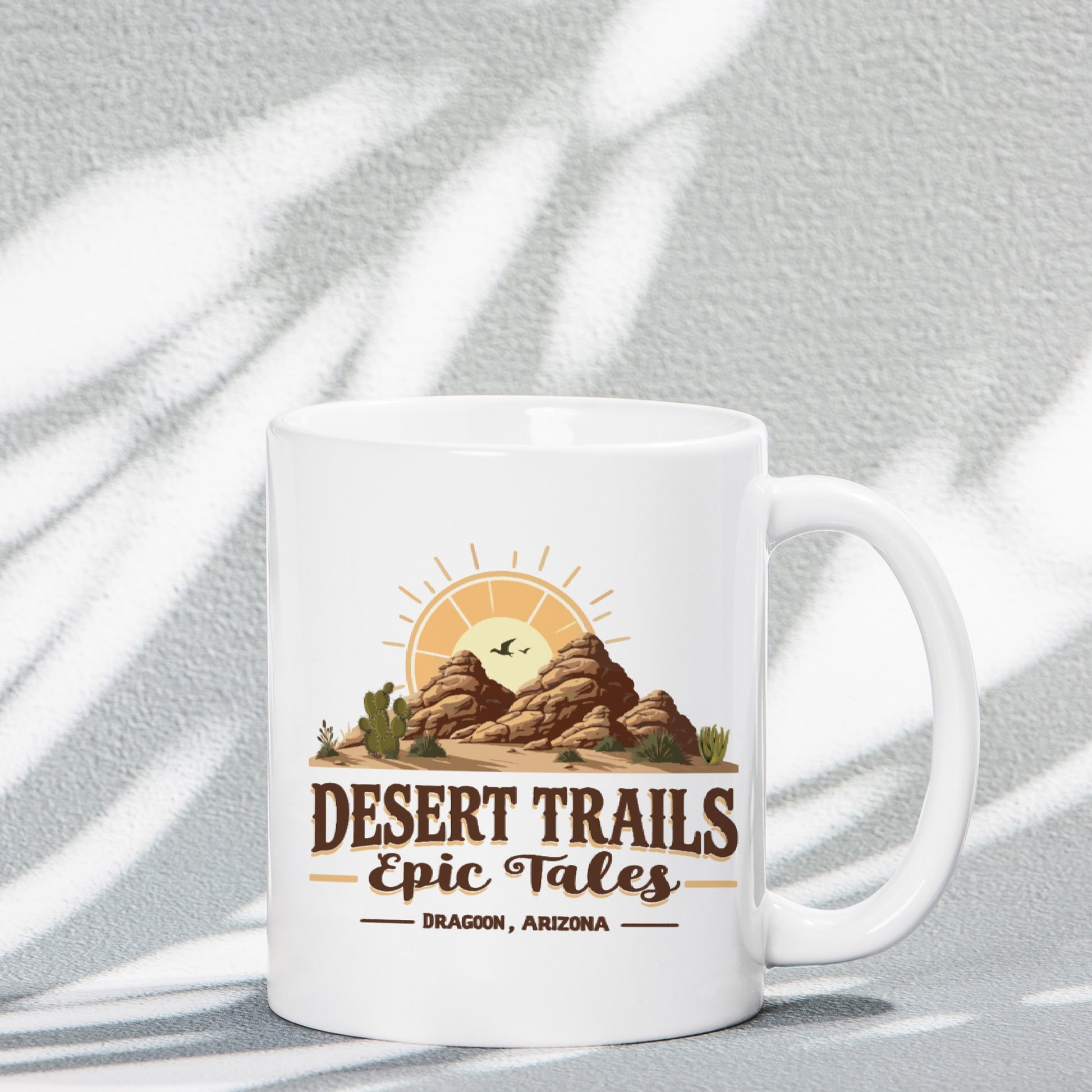 Start your day with adventure! This Dragoon-themed mug features the rugged rocks, radiant sun, and the inspiring words 'Desert Trails, Epic Tales, Dragoon, Arizona.' A perfect keepsake for lovers of the Southwest!